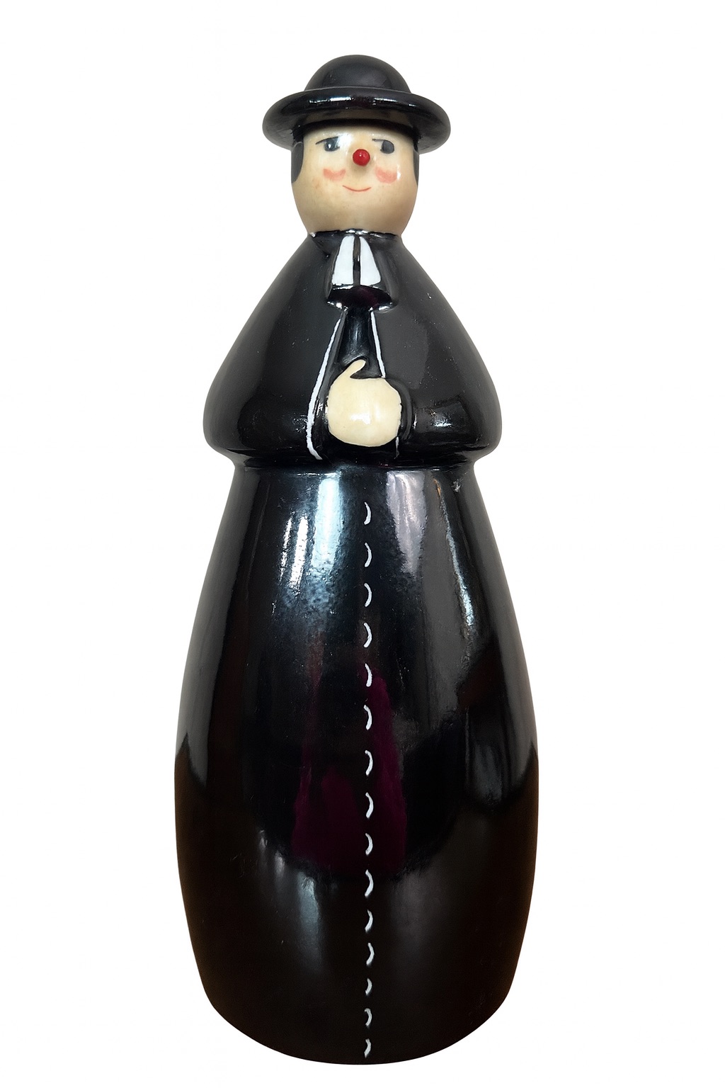 Charmante bouteille en céramique signée ROBJ, représentant un prêtre stylisé, pièce intitulée « Curé pour l’alcool » et réalisée vers 1900.