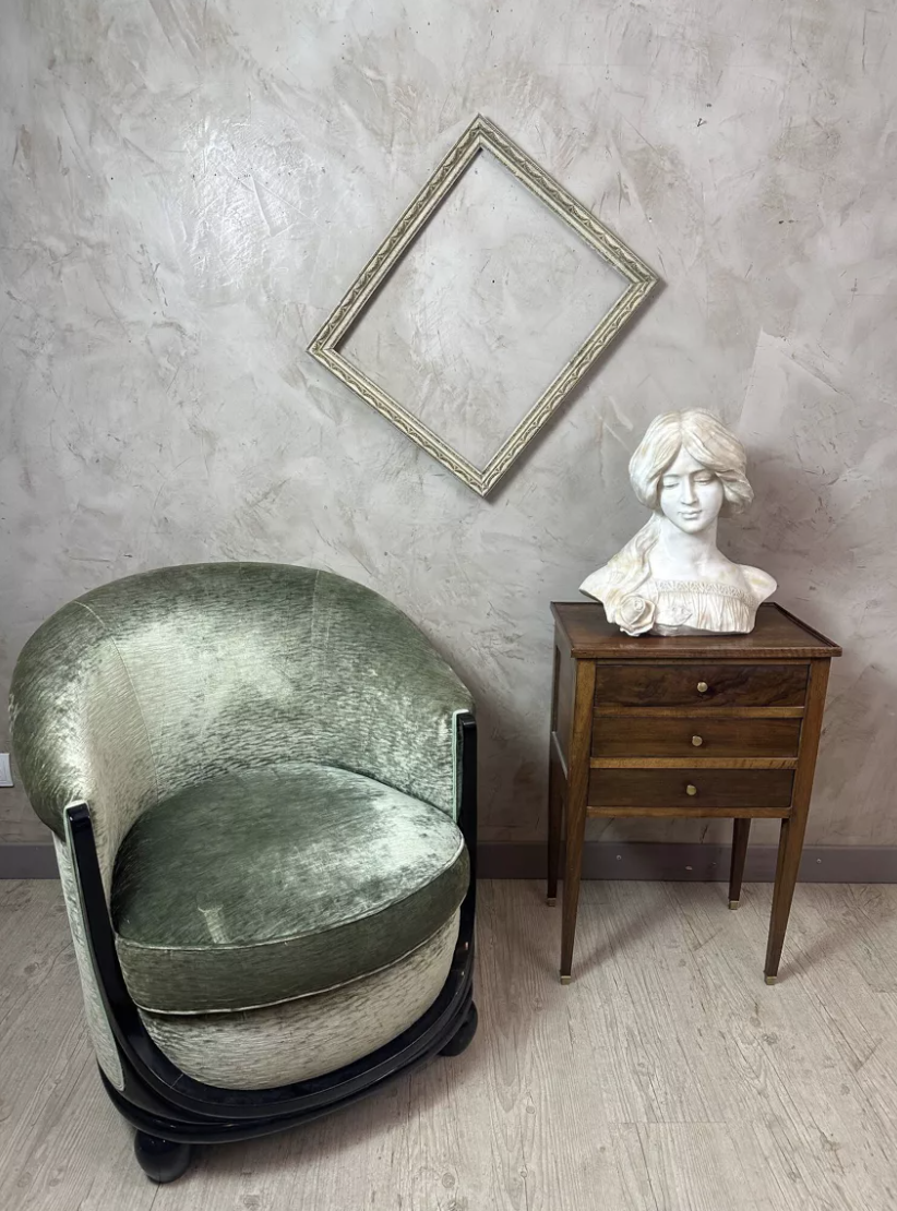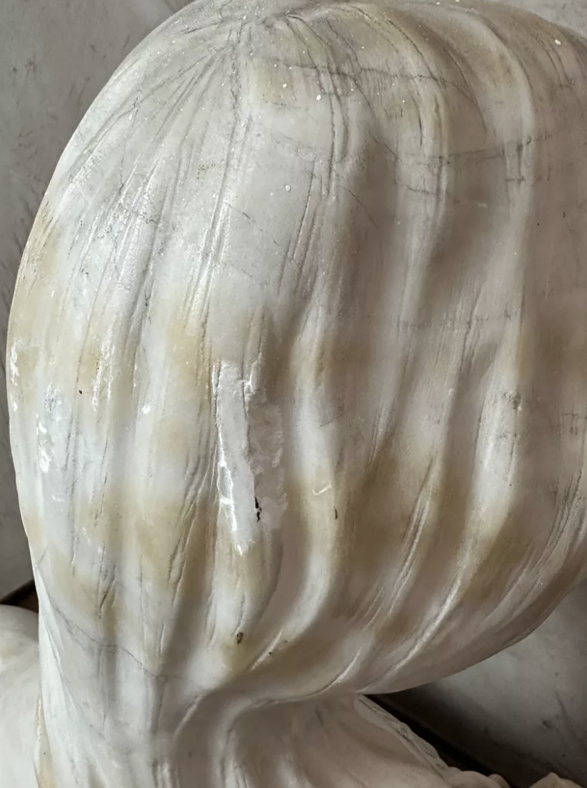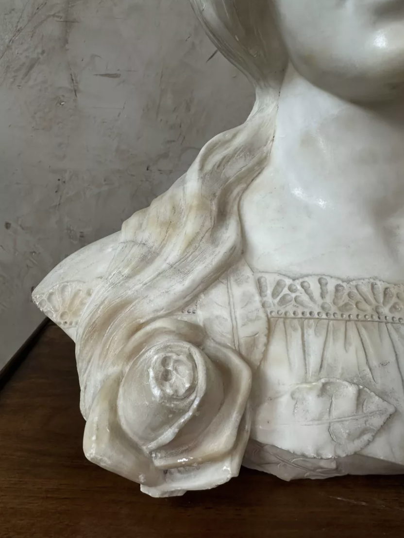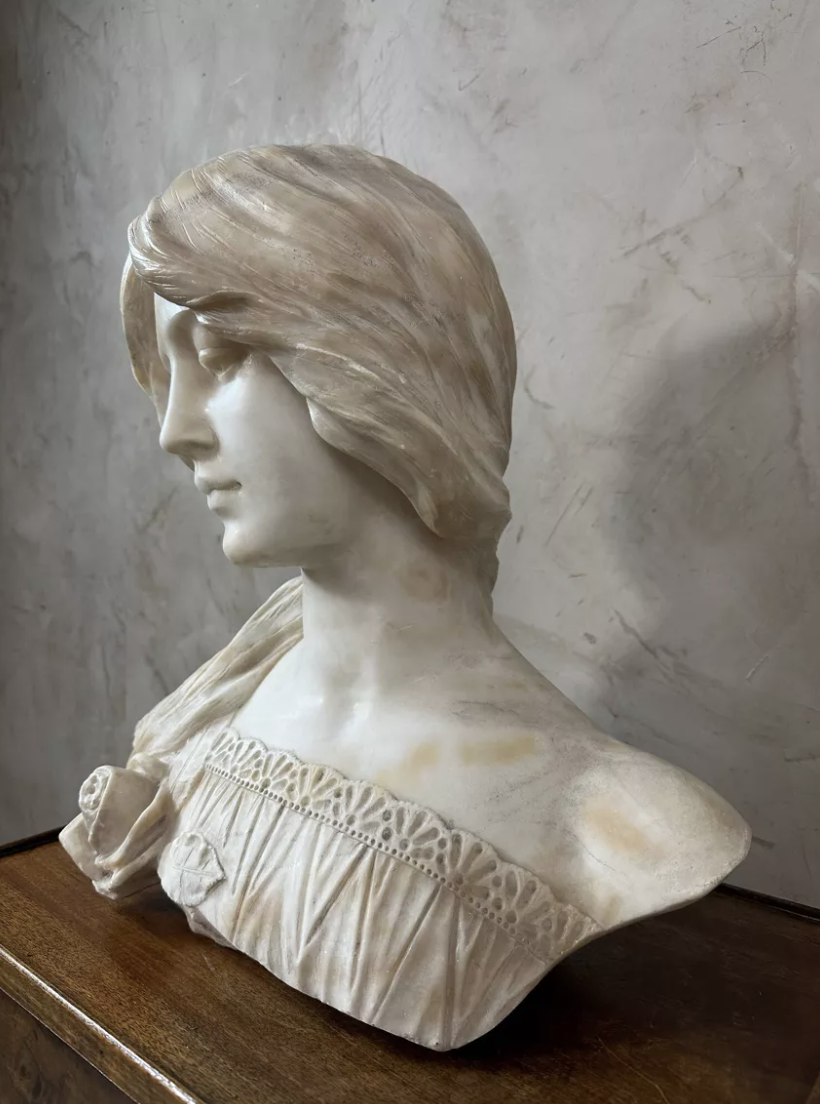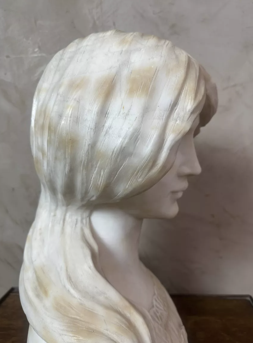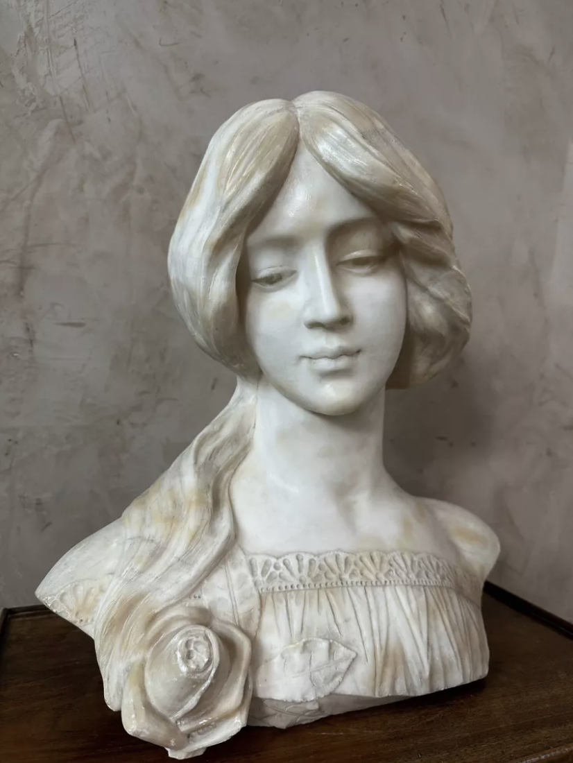 Superbe buste en marbre sculpté représentant une jeune femme aux traits délicats, typique de l’esthétique Art Nouveau. Son visage empreint de douceur et sa coiffure ondulante témoignent d’un remarquable travail du sculpteur. Les détails minutieux de la chevelure, du drapé et de la fleur ornant son buste illustrent à la fois finesse et maîtrise artistique. Au dos, la signature Hillebrand atteste de l’authenticité de l’œuvre. Réalisée dans un marbre lumineux aux nuances chaudes, cette sculpture dégage une présence poétique et intemporelle. Idéale pour apporter une touche d’élégance à un intérieur classique, contemporain ou éclectique. État : Bon état général, patine naturelle du temps et légère accident à l’arrière. Pièce rare et décorative, parfaite pour collectionneur, amateur d’art ou décoration raffinée. Une œuvre sensible et élégante qui captera immédiatement le regard.