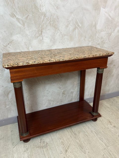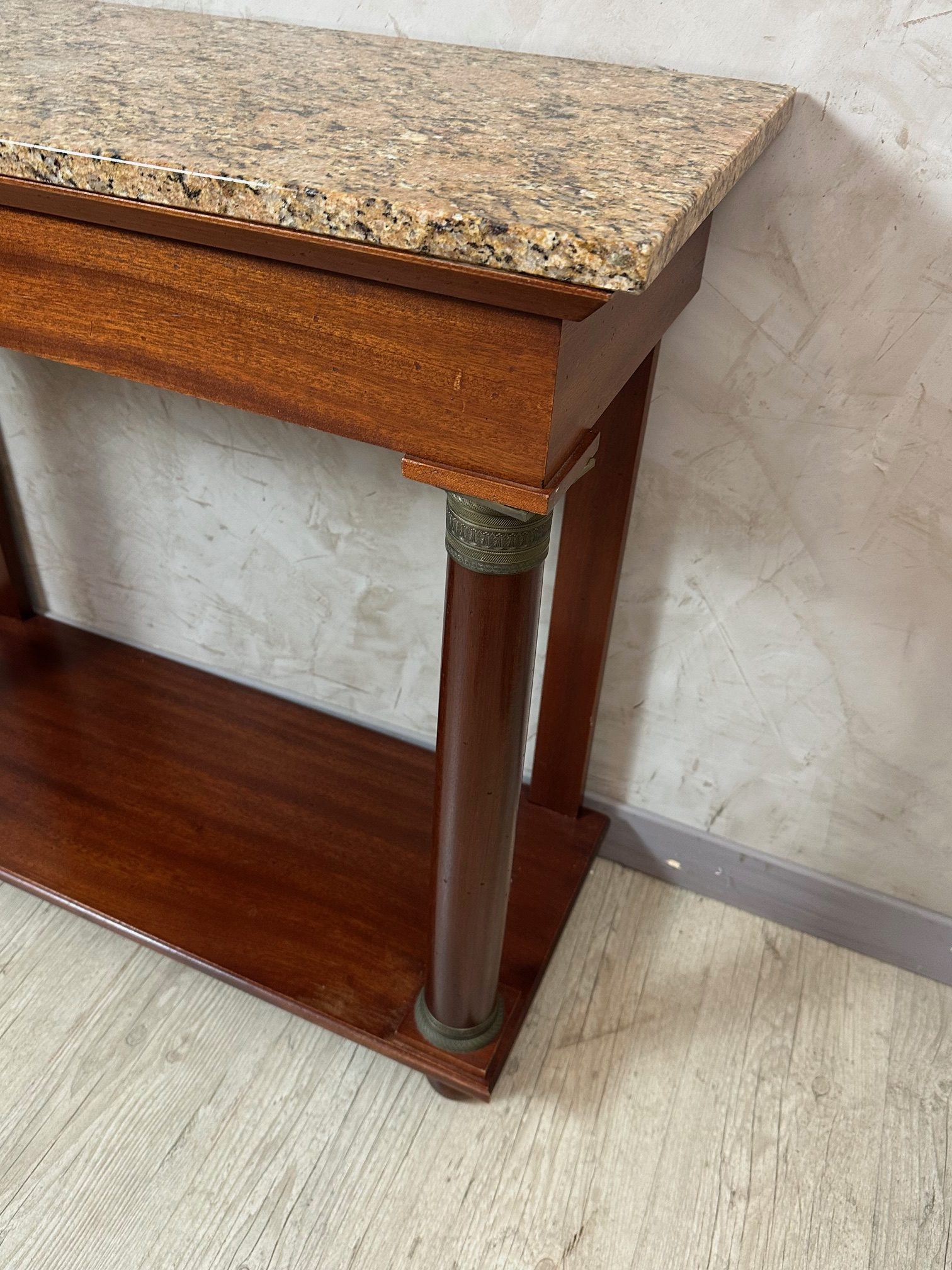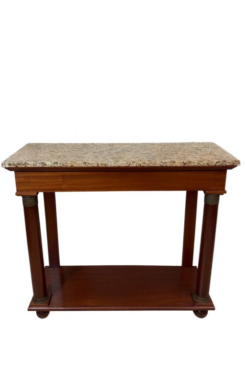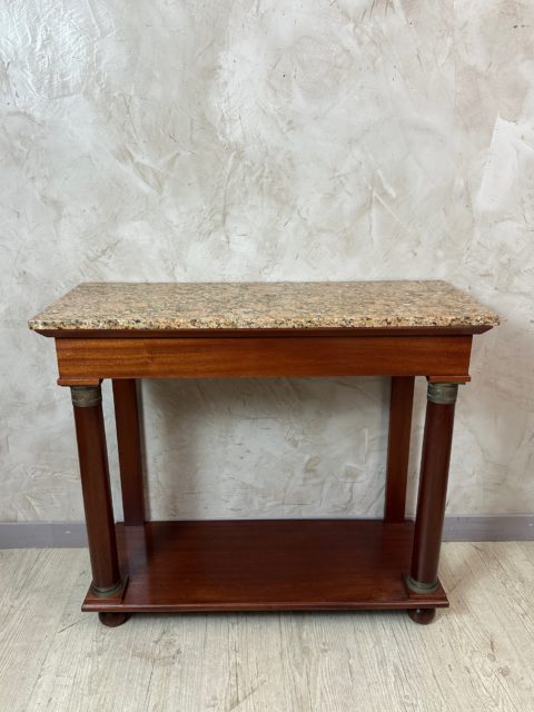 Élégante console de style Empire réalisée en merisier, reposant sur quatre colonnes tournées ornées de bagues en bronze.