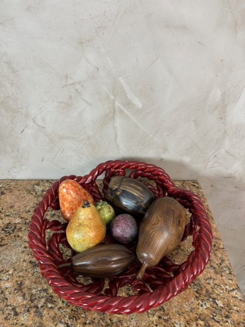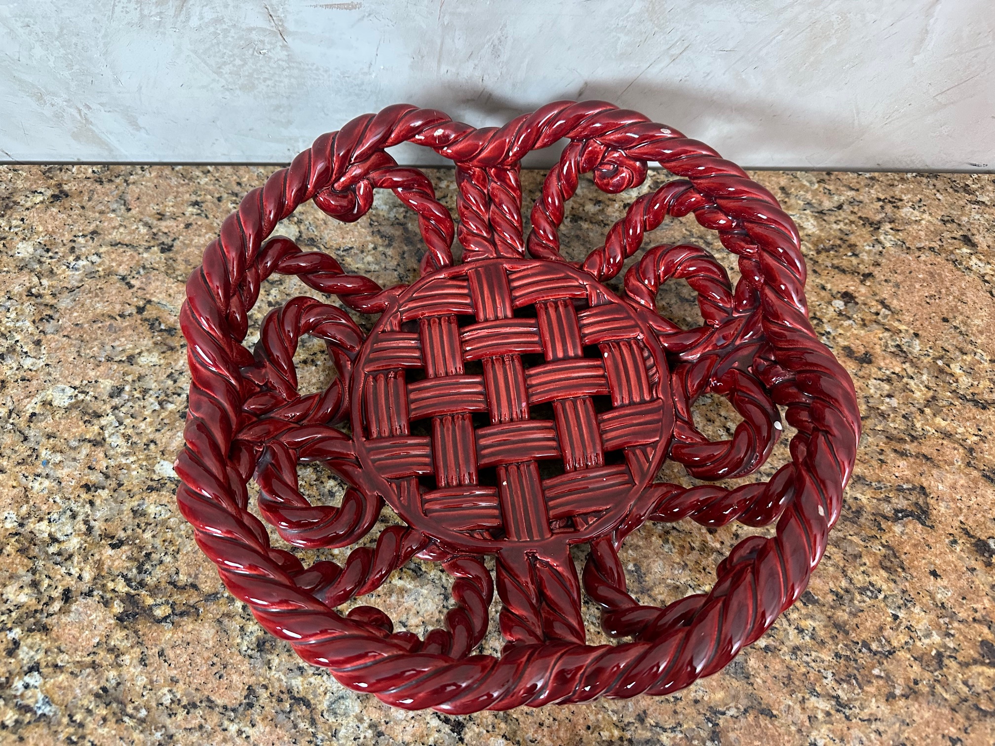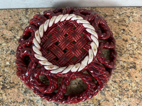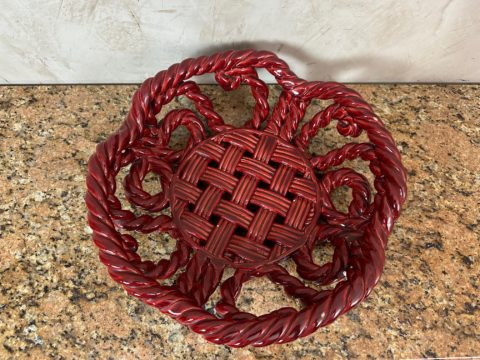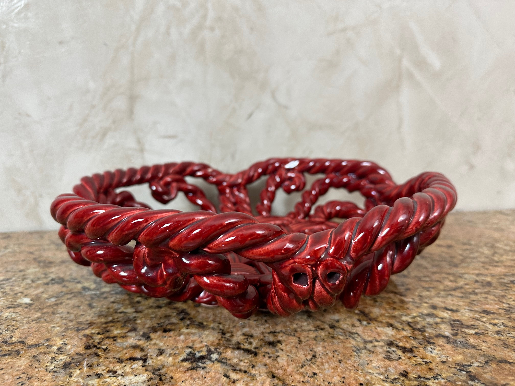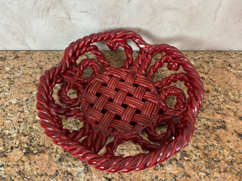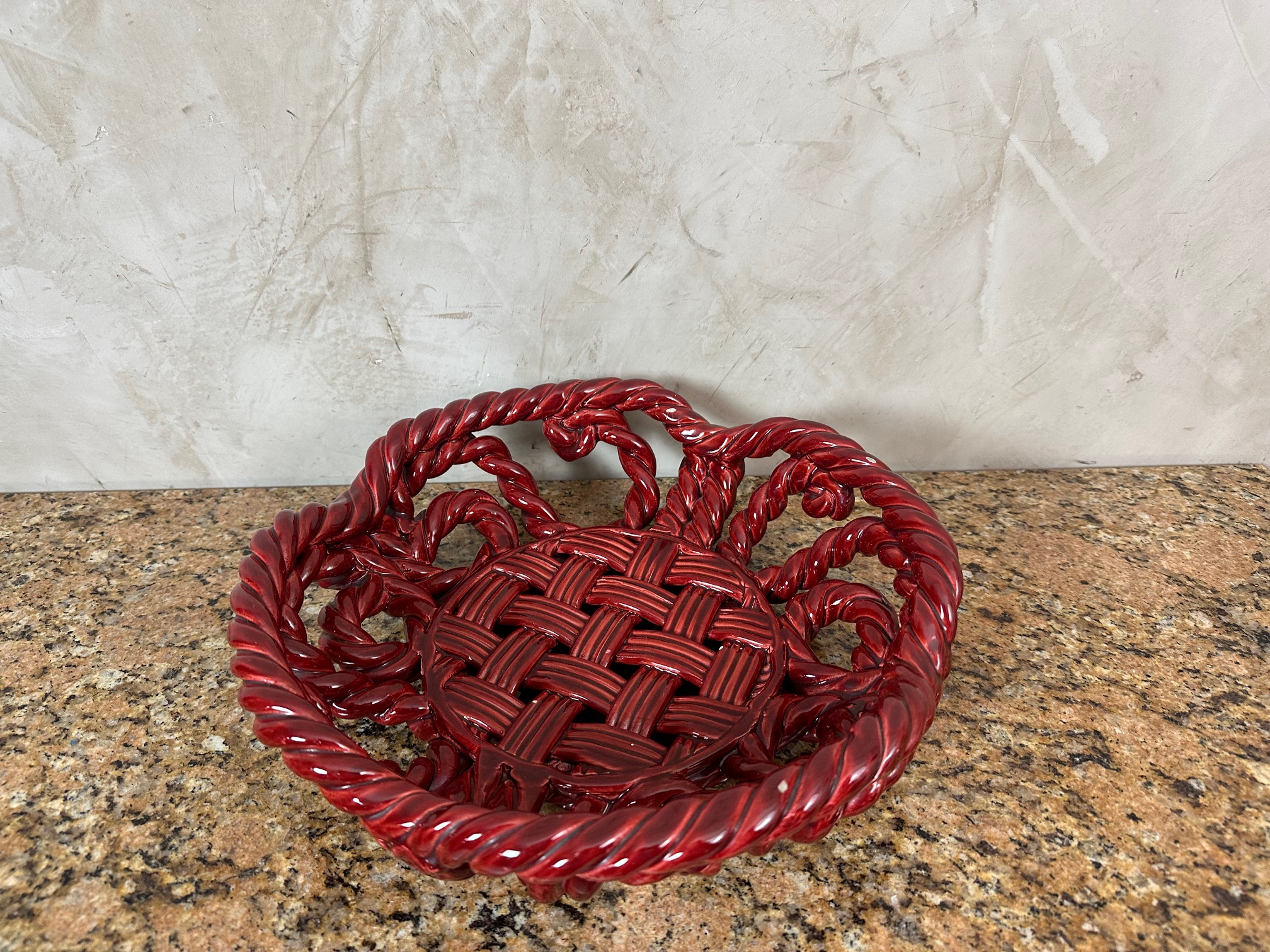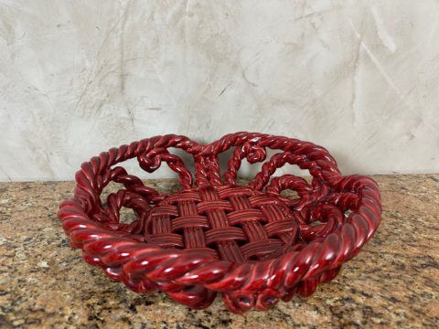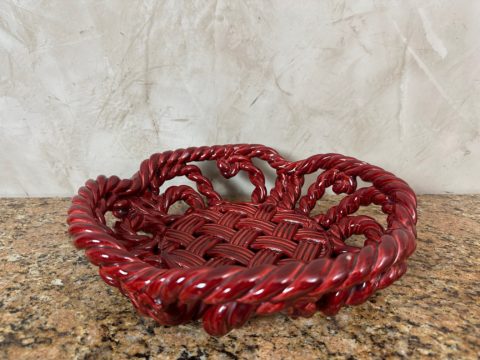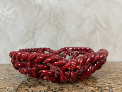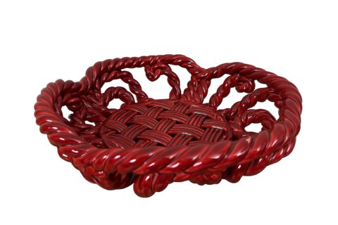Élégante corbeille en céramique émaillée, travaillée dans un décor de cordages torsadés et entrelacés, formant un tressage raffiné. Son émail rouge profond et brillant lui confère un caractère à la fois décoratif et original.