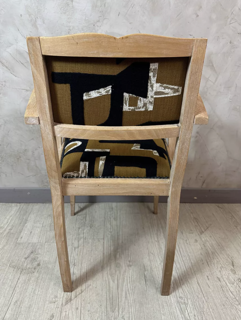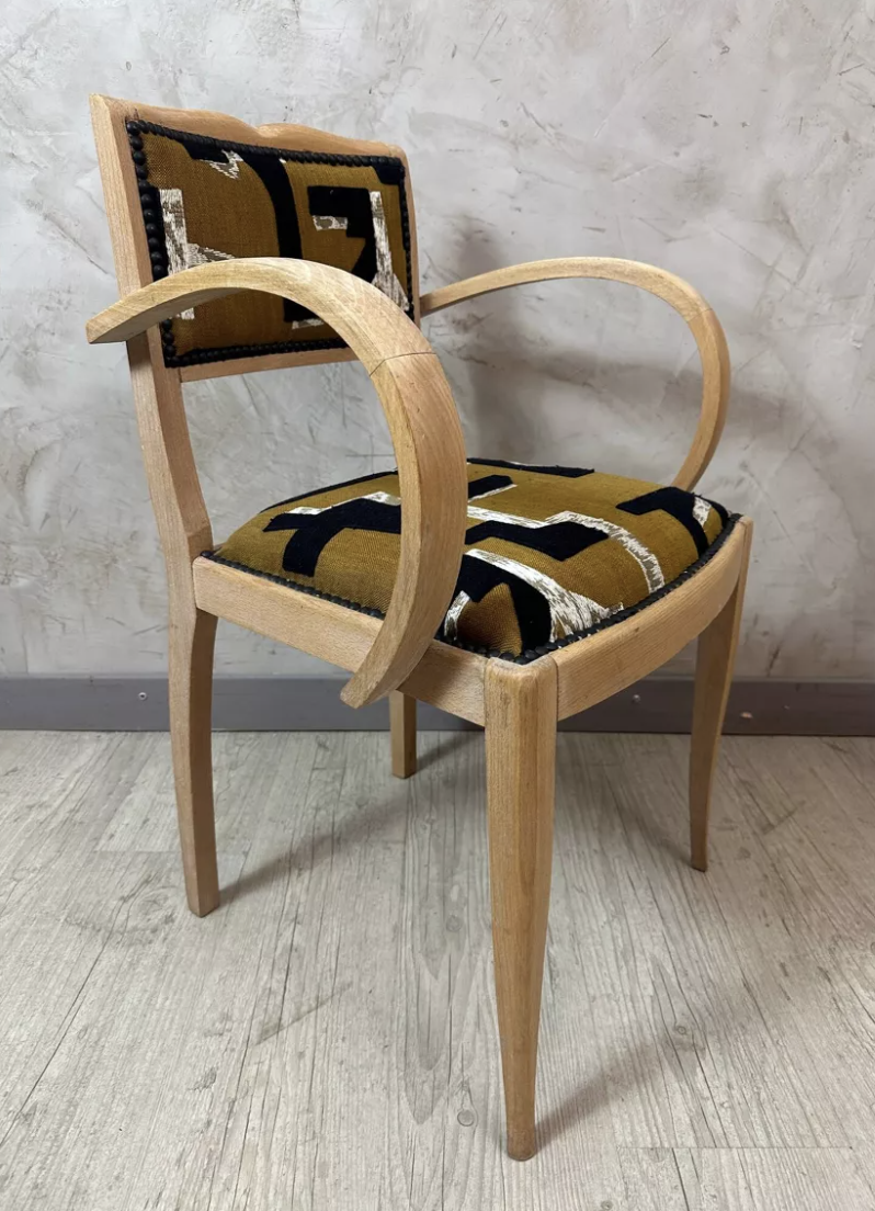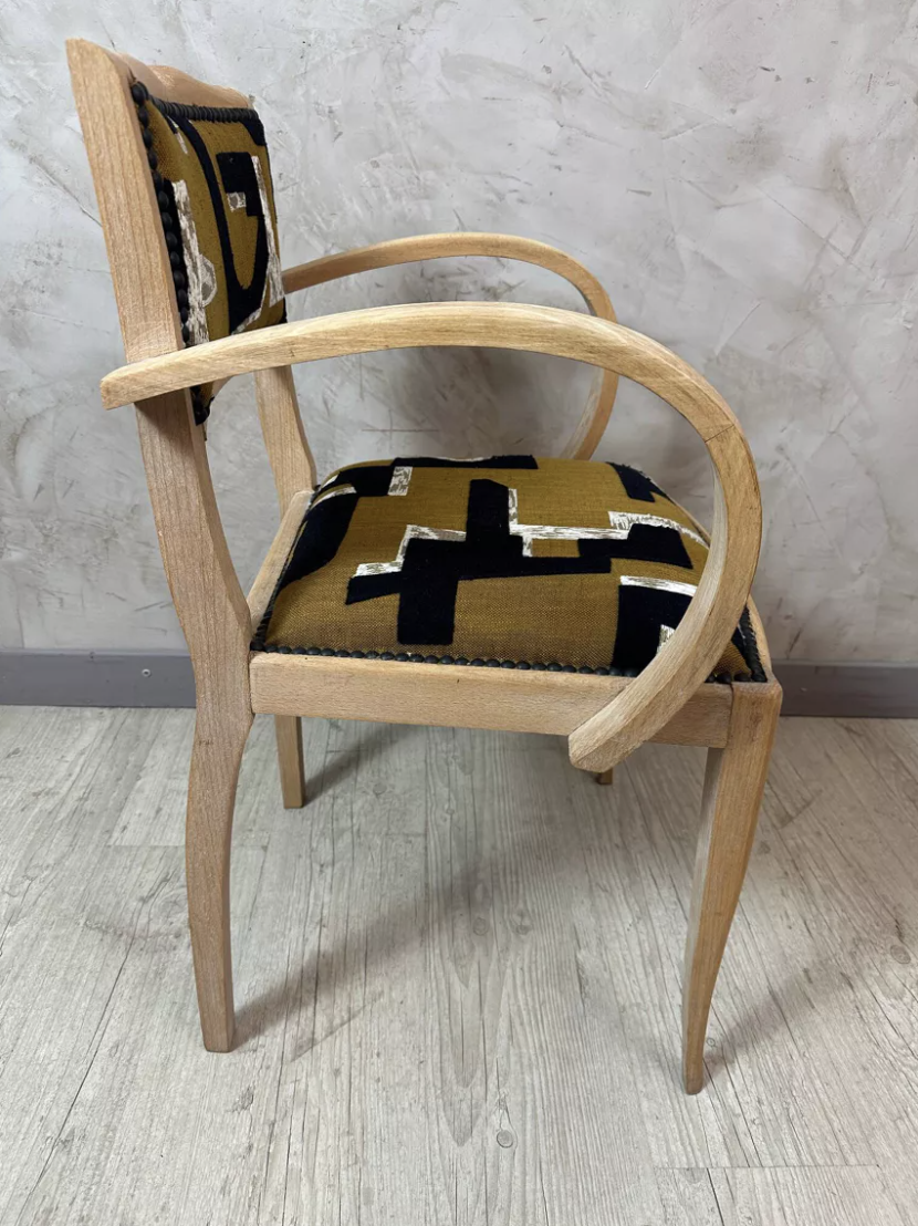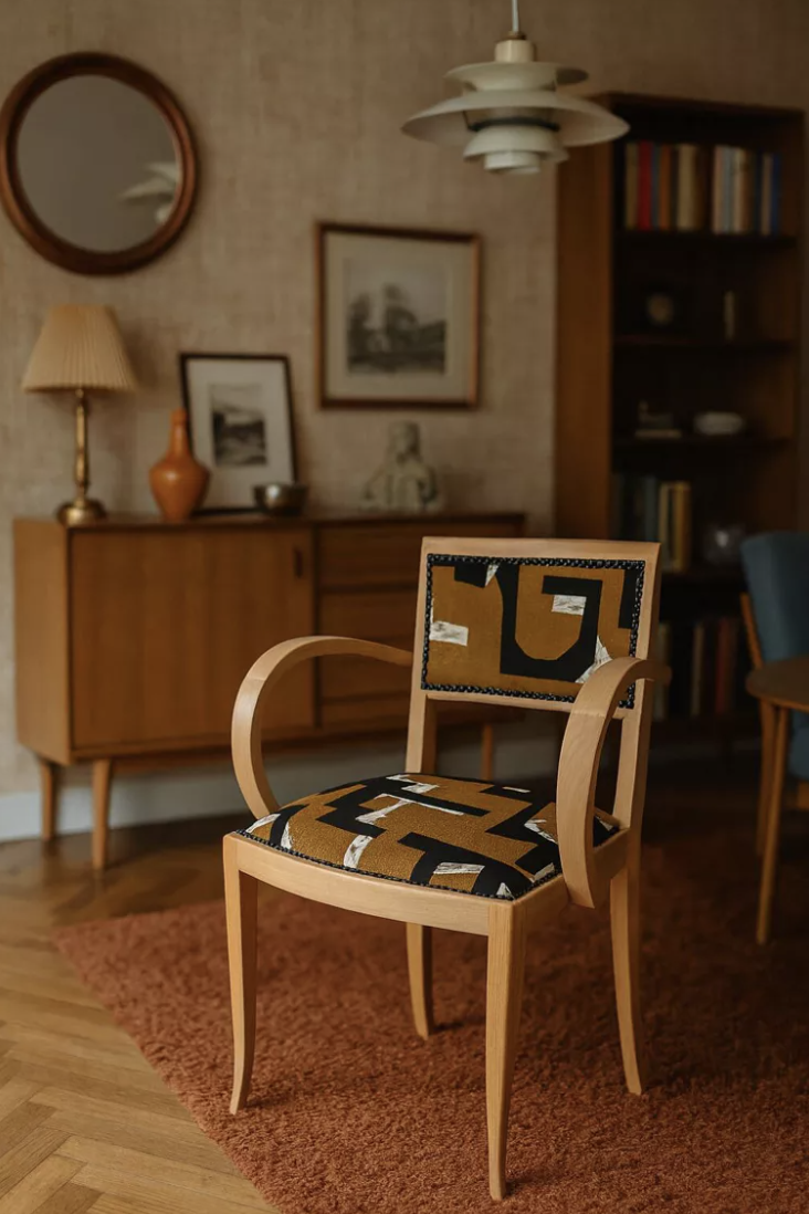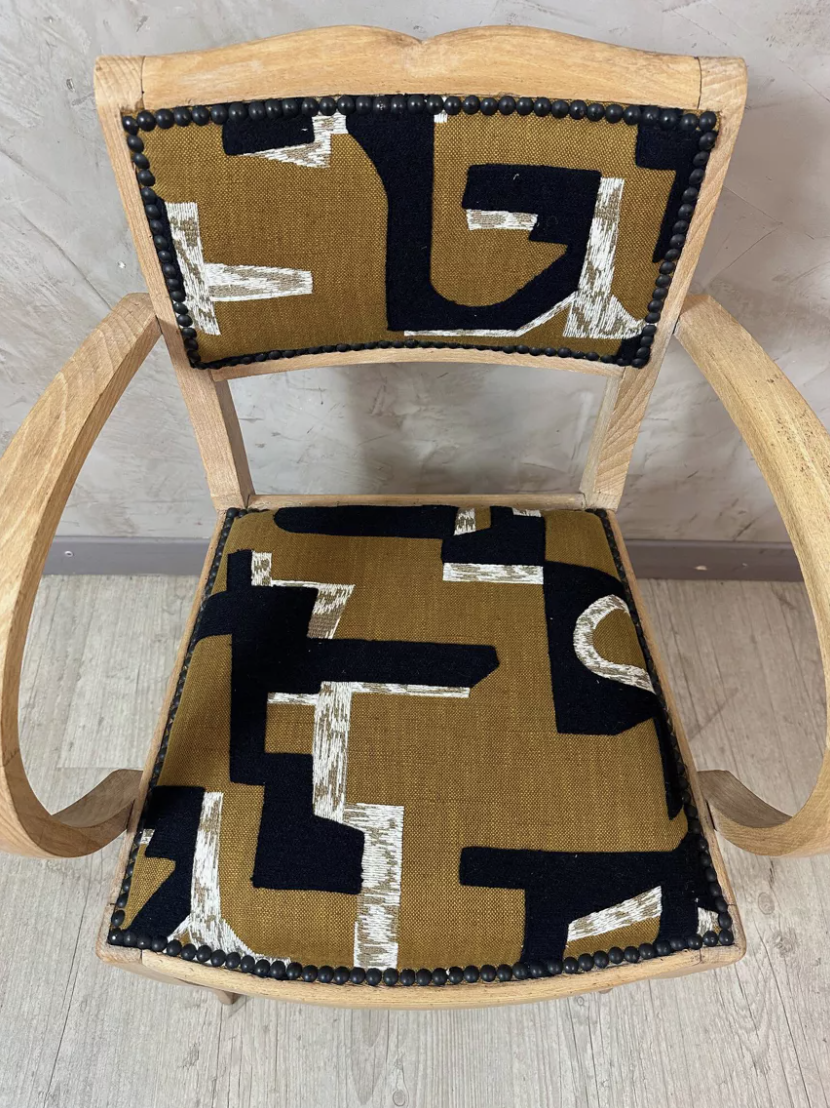 Superbe fauteuil « Bride » au design élégant, restauré dans notre atelier avec un soin particulier. Nous avons entièrement retapissé l’assise et le dossier dans un tissu haut de gamme Casamance, au motif graphique contemporain alliant style et caractère. Les couleurs profondes – mêlant ocre, noir et touches d’ivoire – apportent une véritable identité à la pièce. La structure en bois a été sablée puis laissée naturelle, révélant la beauté de son veinage et donnant au fauteuil un esprit plus moderne, épuré et chaleureux. Ses lignes courbes typiques offrent un confort appréciable et une silhouette singulière, parfaite pour se démarquer dans un salon, un bureau ou un intérieur design. Idéal pour : intérieur vintage chic, contemporain, design, ou pour apporter une touche graphique à une décoration plus classique. Une pièce rare, confortable et décorative, qui allie savoir-faire artisanal et esthétique moderne.