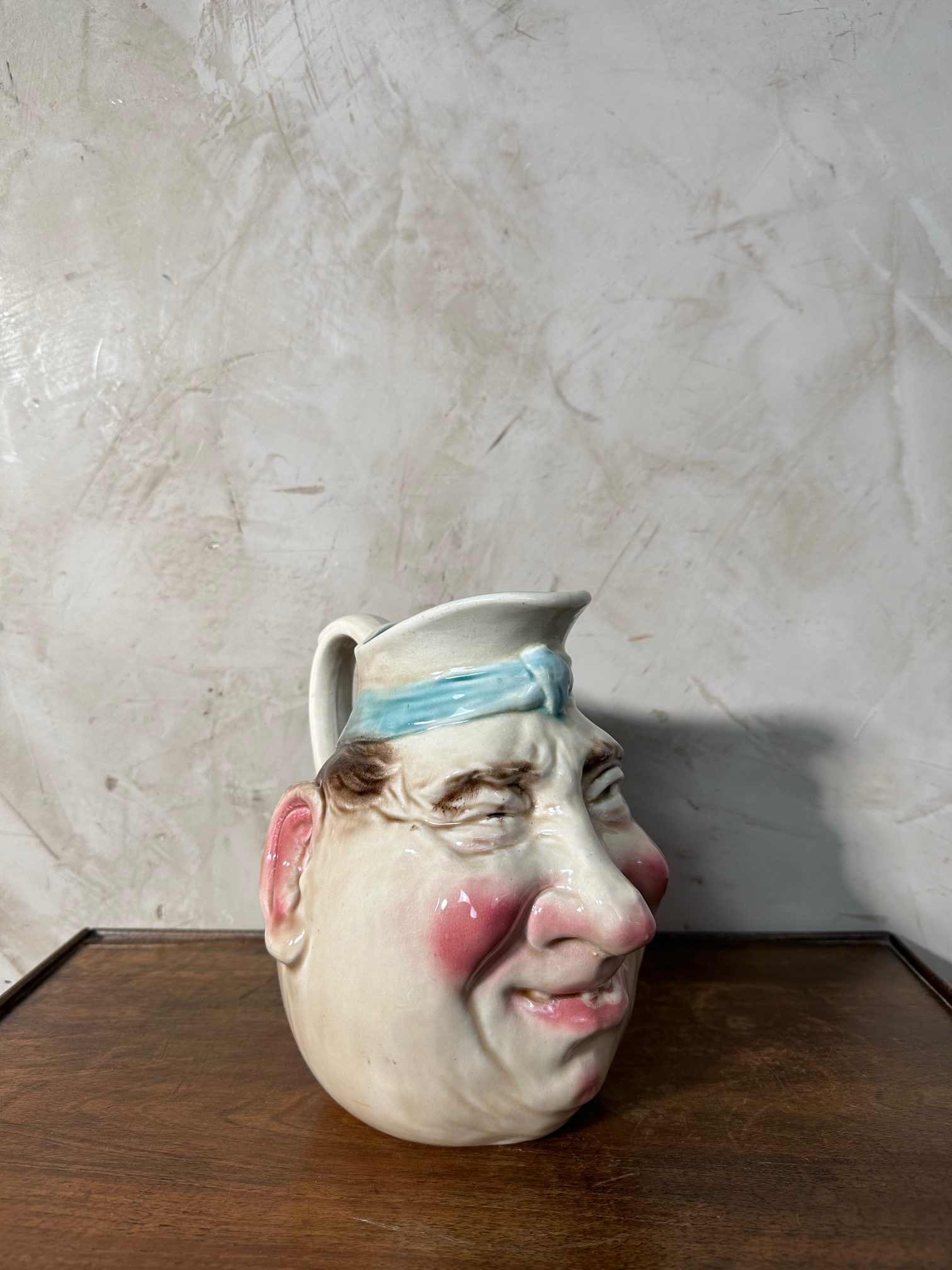 Original pichet en barbotine datant du début du XXᵉ siècle de la fabrique de Sarreguemines représentant une tête d’homme aux traits caricaturés et expressifs. Ce type de pièce humoristique, très en vogue à l’époque, mêle savoir-faire artisanal et esprit fantaisiste.