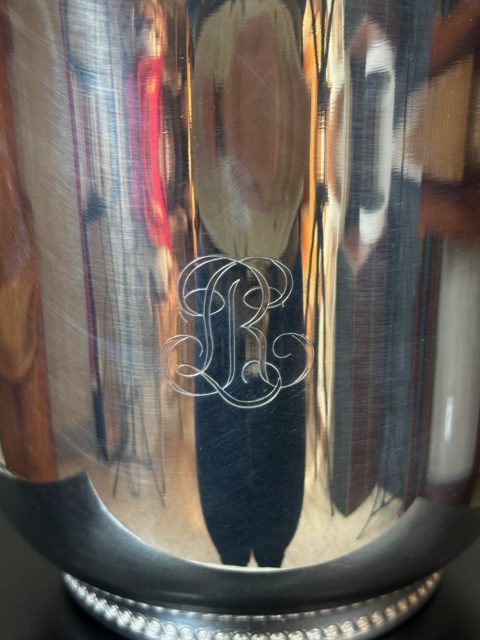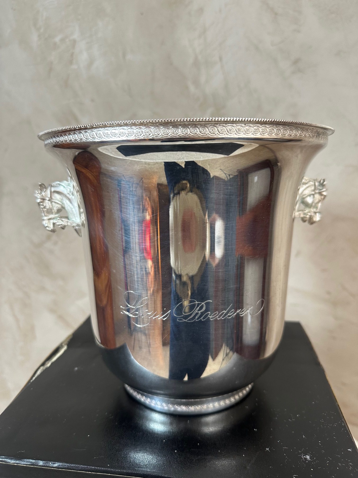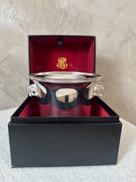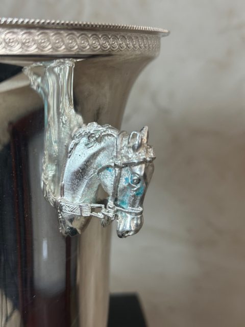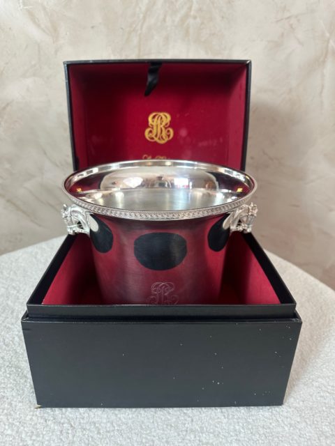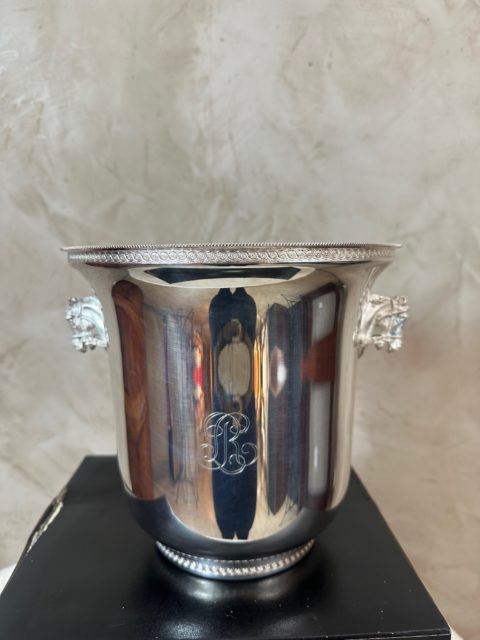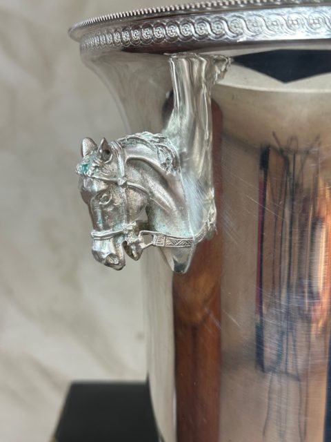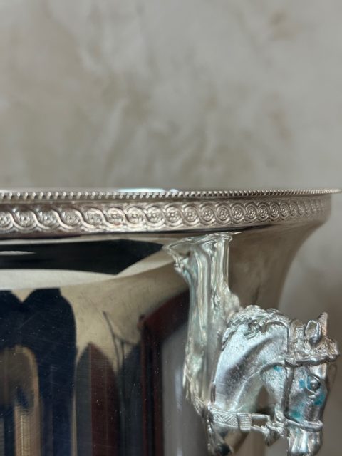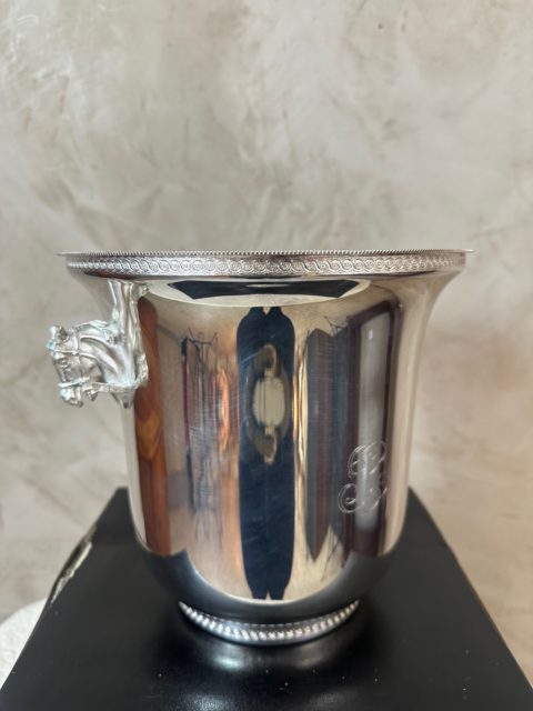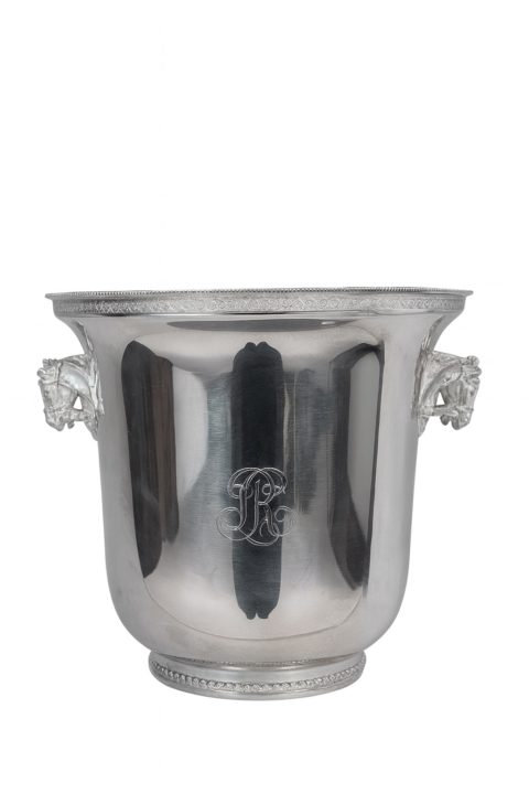 Élégant seau à champagne en métal argenté, orné de poignées latérales finement travaillées en forme de tête de cheval.