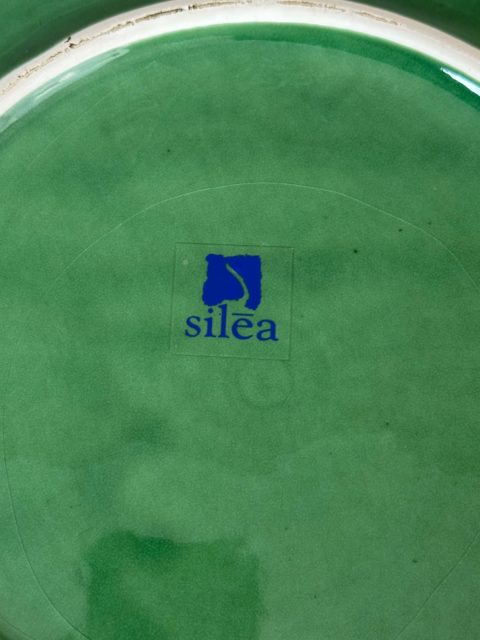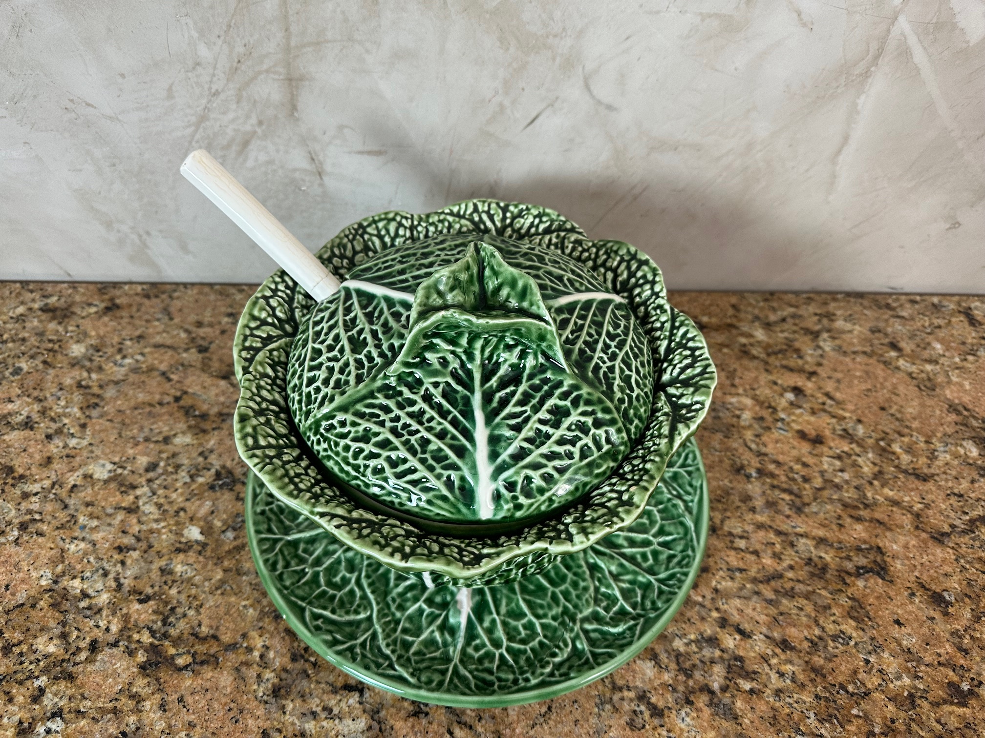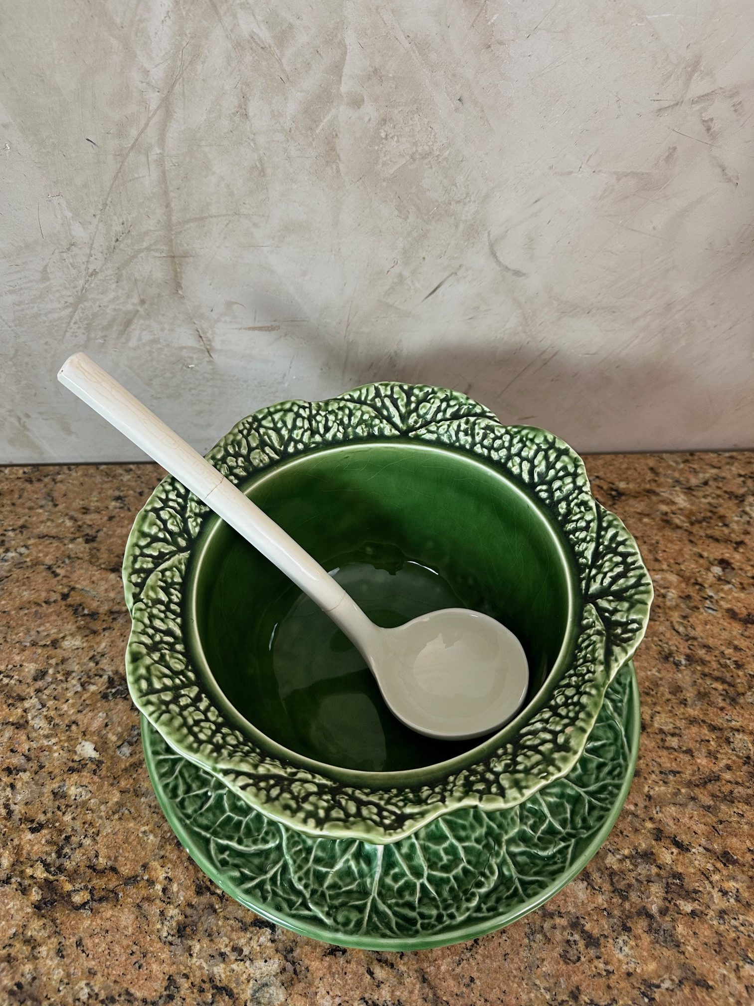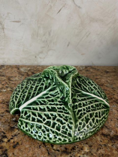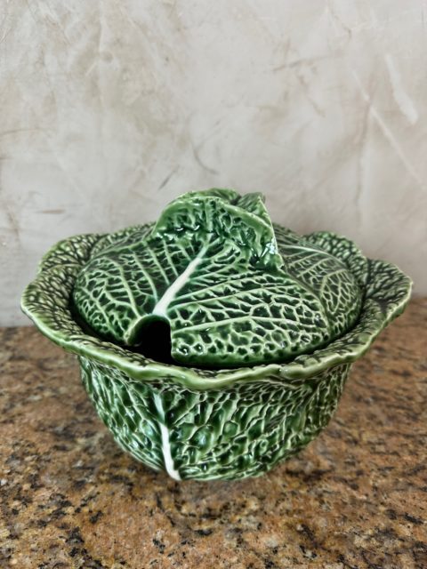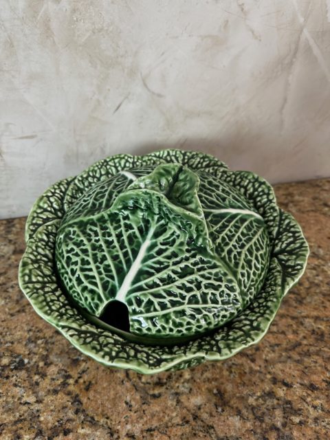 Charmante soupière ancienne en céramique moulée et émaillée, représentant un chou aux détails finement travaillés. Composée de son couvercle assorti, de sa louche (fêlée à deux endroits) et de son présentoir, cette pièce décorative et fonctionnelle incarne l’élégance rustique des arts de la table traditionnels.